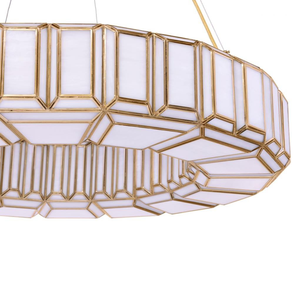 Hand cut emerald stained glass pieces deliver unique flashes of light and reflection via the many individual cuts and surfaces. A rare few are colorless cloudy white and that unusual stone becomes the backbone of this family of brass wrapped white glass. The resulting ring of white will answer the needs of contemporary and traditional homes alike.