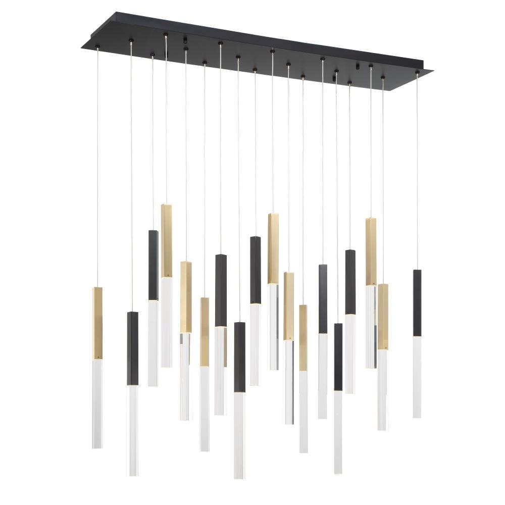 Light is emitted from the top and bottom of this multi piece chandelier