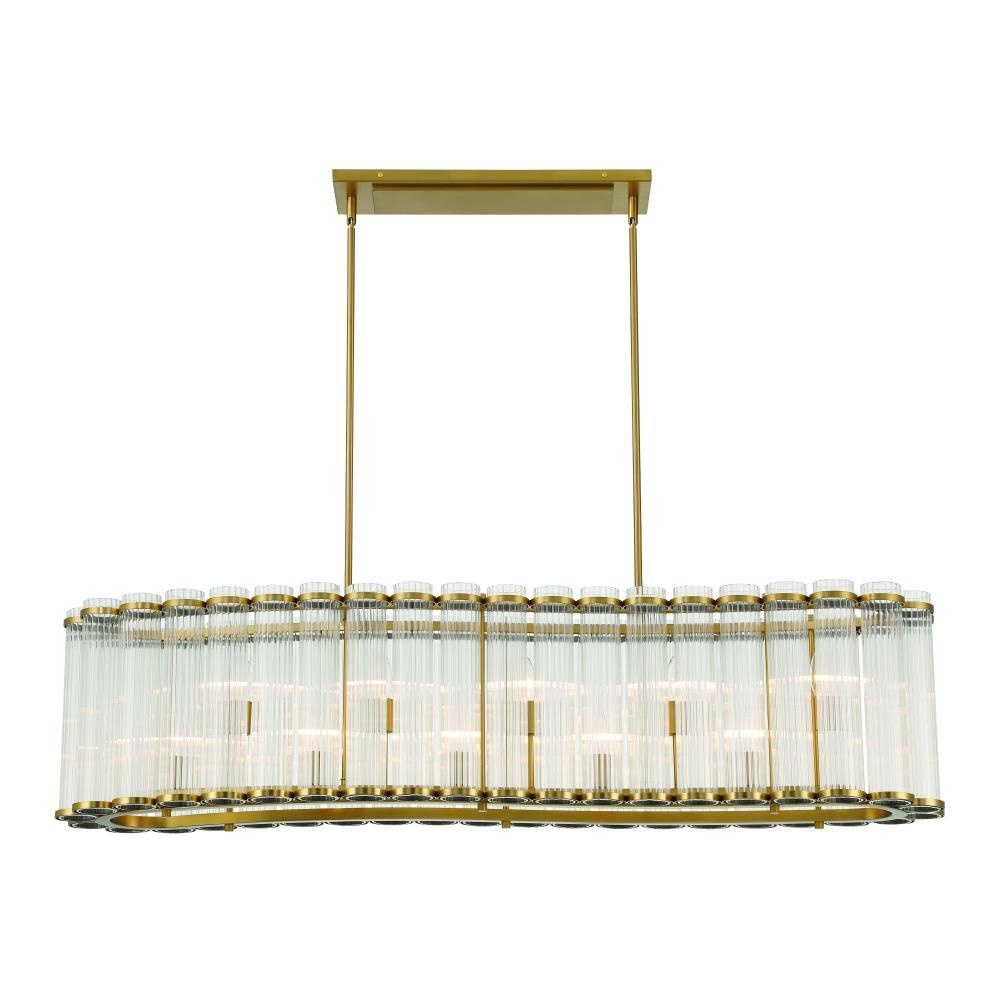 A regiment of ribbed cylinders, linked together at the top, encircle the central light sources to soften and diffuse, unveiling a stately, transitional allure that lends charm to living, entry and dining spaces.