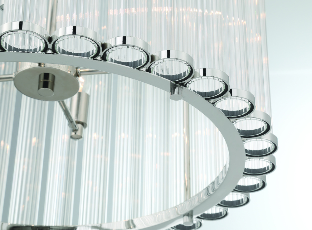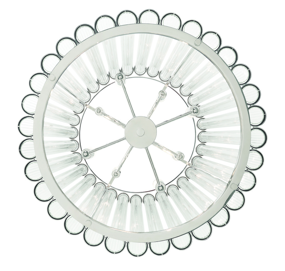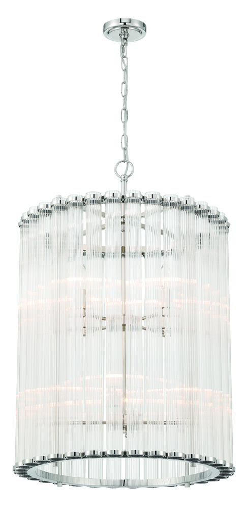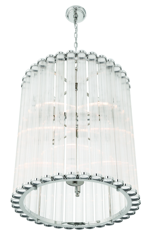 A regiment of ribbed cylinders, linked together at the top, encircle the central light sources to soften and diffuse, unveiling a stately, transitional allure that lends charm to living, entry and dining spaces.