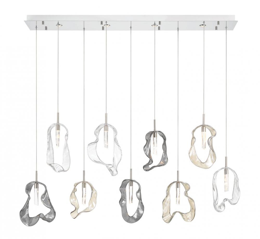 There is a dichotomy between the handmade, freeform glass ribbons and the arctic chisel of quartz crystal they surround. It is further embellished with a trio of colors and the fascinating reflection and refraction emitted when light is introduced. The artistic conflict has created stunning pieces set to define a space.