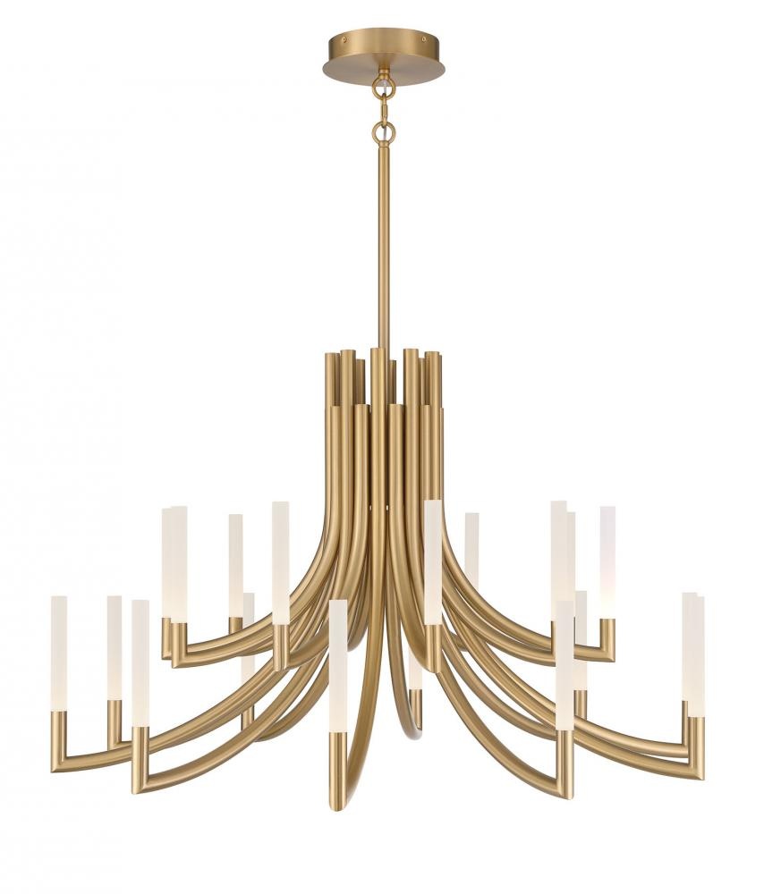 A downward glow, from the central core differentiates this transitional interpretation of a classic chandelier design. Stark lines and sharp bends percolate up to a beacon of light, atop each rod. These are grand pieces designed to complement the room’s principal aesthetic.