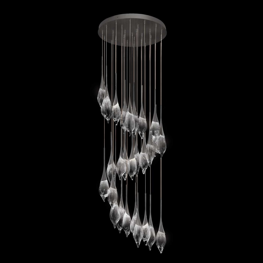 Mayu celebrates the art of glassblowing through delicate, hand-pulled forms shaped by master artisans. Each pendant glows with gentle radiance, transforming space like twilight-revealing the quiet poetry of shadow, light, and artistry within the glass itself.