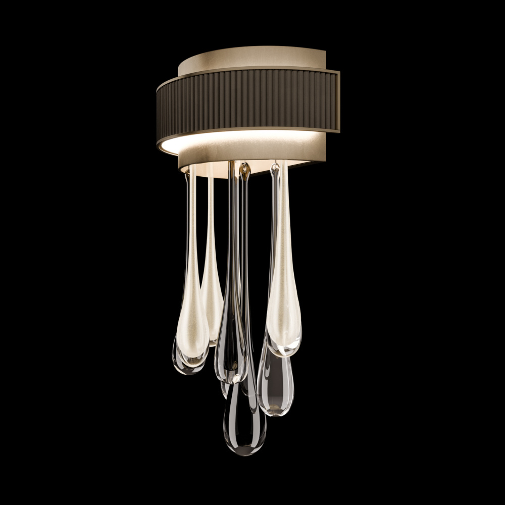 This LED sconce captures the beauty of motion suspended in time-artisan-blown glass “rain” drops infused with swirling mist and illuminated from within. Offered in Silver, Gold, or Copper drops, each paired with clear and black droplets and complemented by a hand-applied ombré finish that enhances its luminous depth.