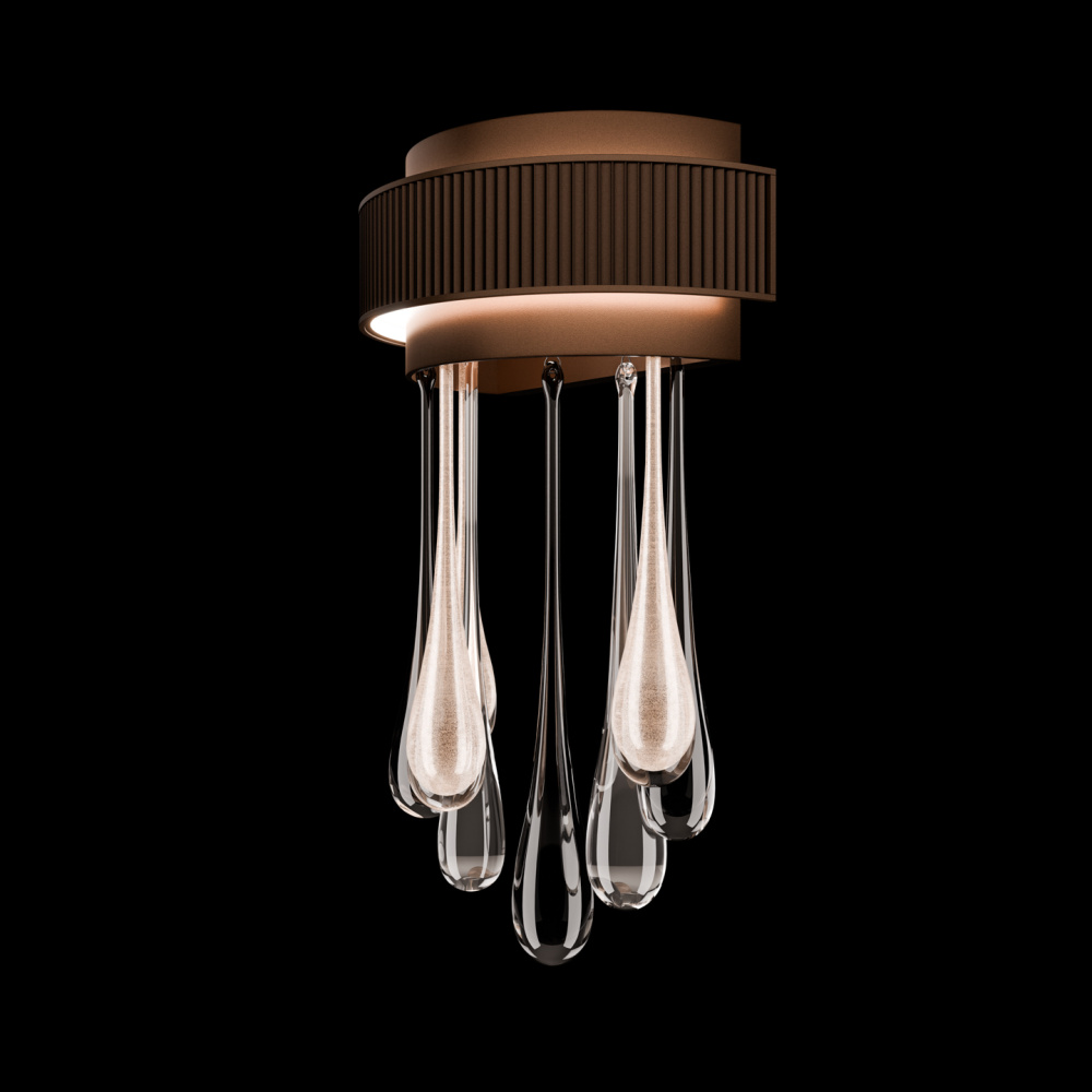 This LED sconce captures the beauty of motion suspended in time-artisan-blown glass “rain” drops infused with swirling mist and illuminated from within. Offered in Silver, Gold, or Copper drops, each paired with clear and black droplets and complemented by a hand-applied ombré finish that enhances its luminous depth.