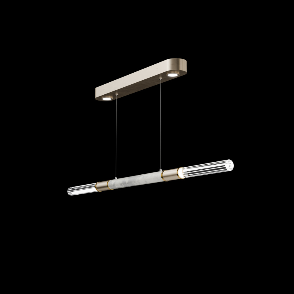 Suspended by adjustable cords, this LED fixture features straight tubular lines and the inclusion of metals carefully handcrafted to transition from parchment to magnificent glass, culminating in a stunning beam of light. Available in a wide range of exquisite finishes, including our five standard finishes and our newest Soft Ombre Bronze & Soft Ombre Silver, with choice parchment colors. Also available with no parchment. Upper & lower lights can be wired independently for single or dual light control.