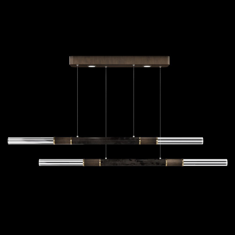 Suspended by adjustable cords, this LED fixture features straight tubular lines and the inclusion of metals carefully handcrafted to transition from parchment to magnificent glass, culminating in a stunning beam of light. Available in a wide range of exquisite finishes, including our five standard finishes and our newest Soft Ombre Bronze & Soft Ombre Silver, with choice parchment colors. Also available with no parchment. Upper & lower lights can be wired independently for single or dual light control.
