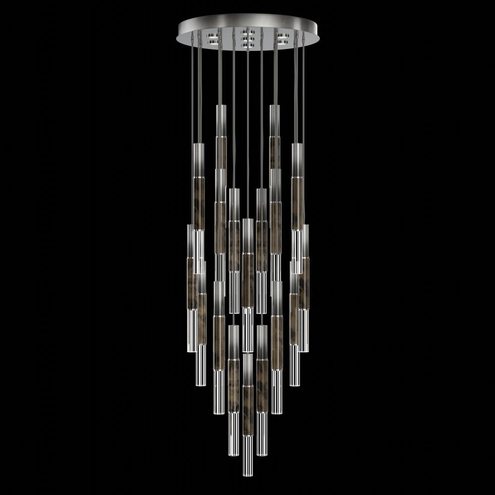 Suspended by braided adjustable cords, this LED fixture features straight tubular lines and the inclusion of metals carefully handcrafted to transition from parchment to magnificent glass, culminating in a stunning beam of light. Available in a wide range of exquisite finishes, including our five standard finishes and our newest Soft Ombre Bronze & Soft Ombre Silver, with the choice of two inline parchment colors, Charcoal and Smoke, and three special order options: Mink, Burnt Orange & Navy/Gold. Also available with no parchment. Upper & lower lights can be wired independently for single or dual light control.