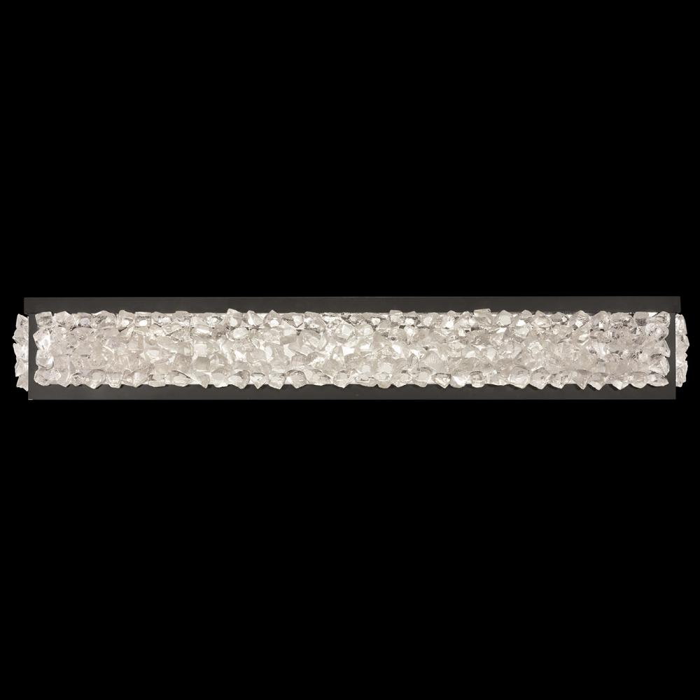 Luxury LED bath fixture in a matte black finish featuring hundreds of rough cut crystal glass gems that refract light in a manner reminiscent to the cirrus clouds ice crystals that form the lunar halo in the frozen night sky. Also available in platinized silver leaf or champagne tinted gold leaf.