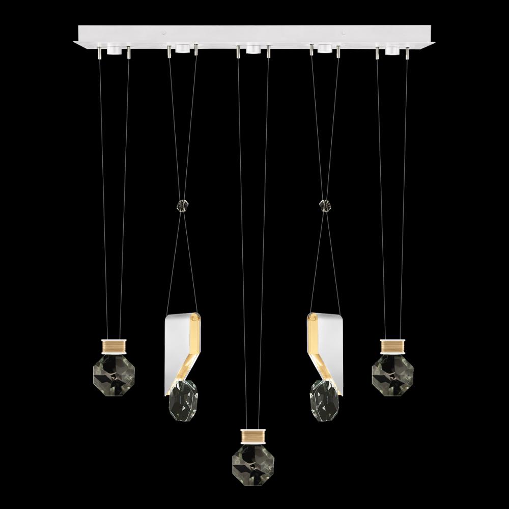 Five-drop linear pendant inspired by the sophistication and versatility of necklace charms. This collection empowers you to curate your unique piece with its five exquisite finishes and four distinct charm designs meticulously crafted using opulent faceted optic crystal. Each charm shines like a gem, captivating attention. Whether you desire the delicate dance of light reflecting off the crystal or the functional illumination from above, Aria's integrated LED lights bring your vision to life.