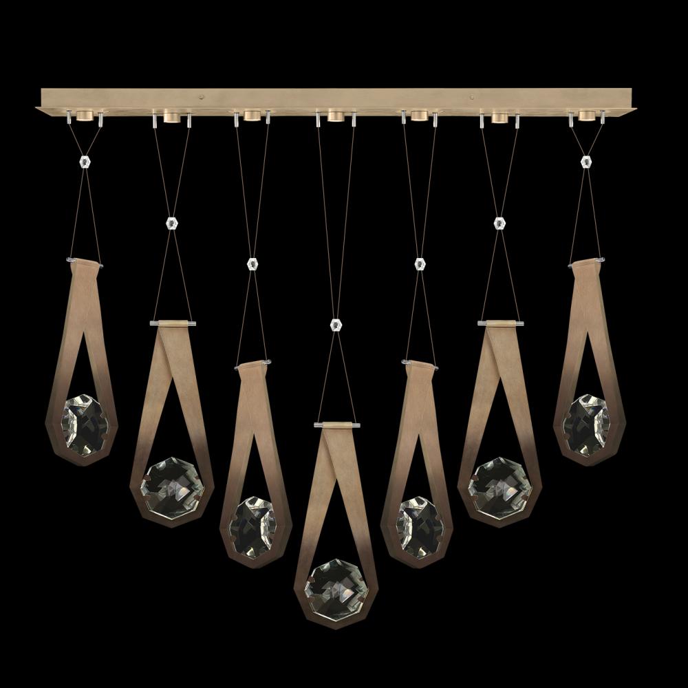 Seven-drop linear pendant inspired by the sophistication and versatility of necklace charms. This collection empowers you to curate your unique piece with its five exquisite finishes and four distinct charm designs meticulously crafted using opulent faceted optic crystal. Each charm shines like a gem, captivating attention. Whether you desire the delicate dance of light reflecting off the crystal or the functional illumination from above, Aria's integrated LED lights bring your vision to life.