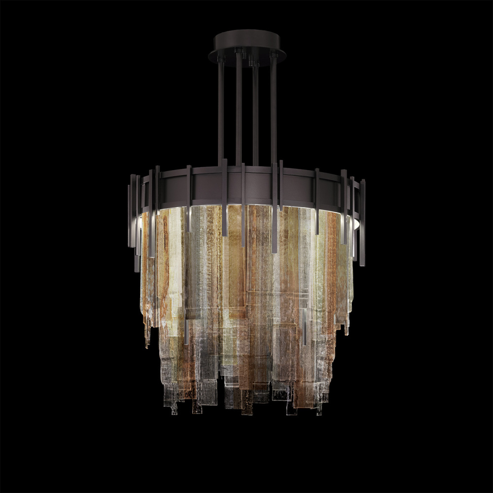 Inspired by the love of Jazz and the harmonious arrangement of musical notes, this Arpeggio pendant features panels of cascading glass fused together to create a chorus of visual delight.The collection emulates melody and movement, characterized by its multi-layered design of fused-glass panels, combining clear and colored glass to create a captivating, textured look.Color glass options feature textured glass panels masterfully layered and fused together in clear, or multi-tonal mix of clear, smoke, and bronze, with Midnight Steel or Soft Gold Leaf finish options.