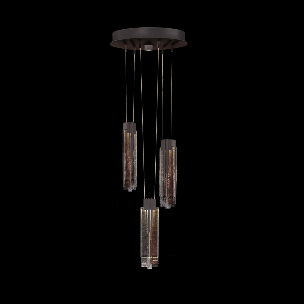 Inspired by the love of Jazz and the harmonious arrangement of musical notes, this Arpeggio pendant features panels of cascading glass fused together to create a chorus of visual delight.The collection emulates melody and movement, characterized by its multi-layered design of fused-glass panels, combining clear and colored glass to create a captivating, textured look.Color glass options feature textured glass panels masterfully layered and fused together in clear, or multi-tonal mix of clear, smoke, and bronze, with Midnight Steel or Soft Gold Leaf finish options.