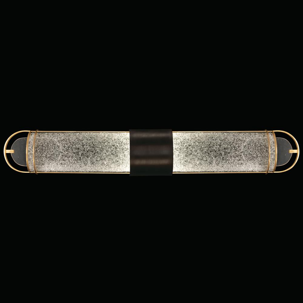 Luxury LED bath fixture featuring illuminated half-cylinders formed by handcrafted glass set within a silhouette, beautifully lit from within, spanning space vertically or horizontally. Shown in our standard Black and Gold Leaf finish with “Diamond Blanket” naturally faceted crystal frit glass, thermally induced to an exact heat, creating a blanket of sparkling crystal.