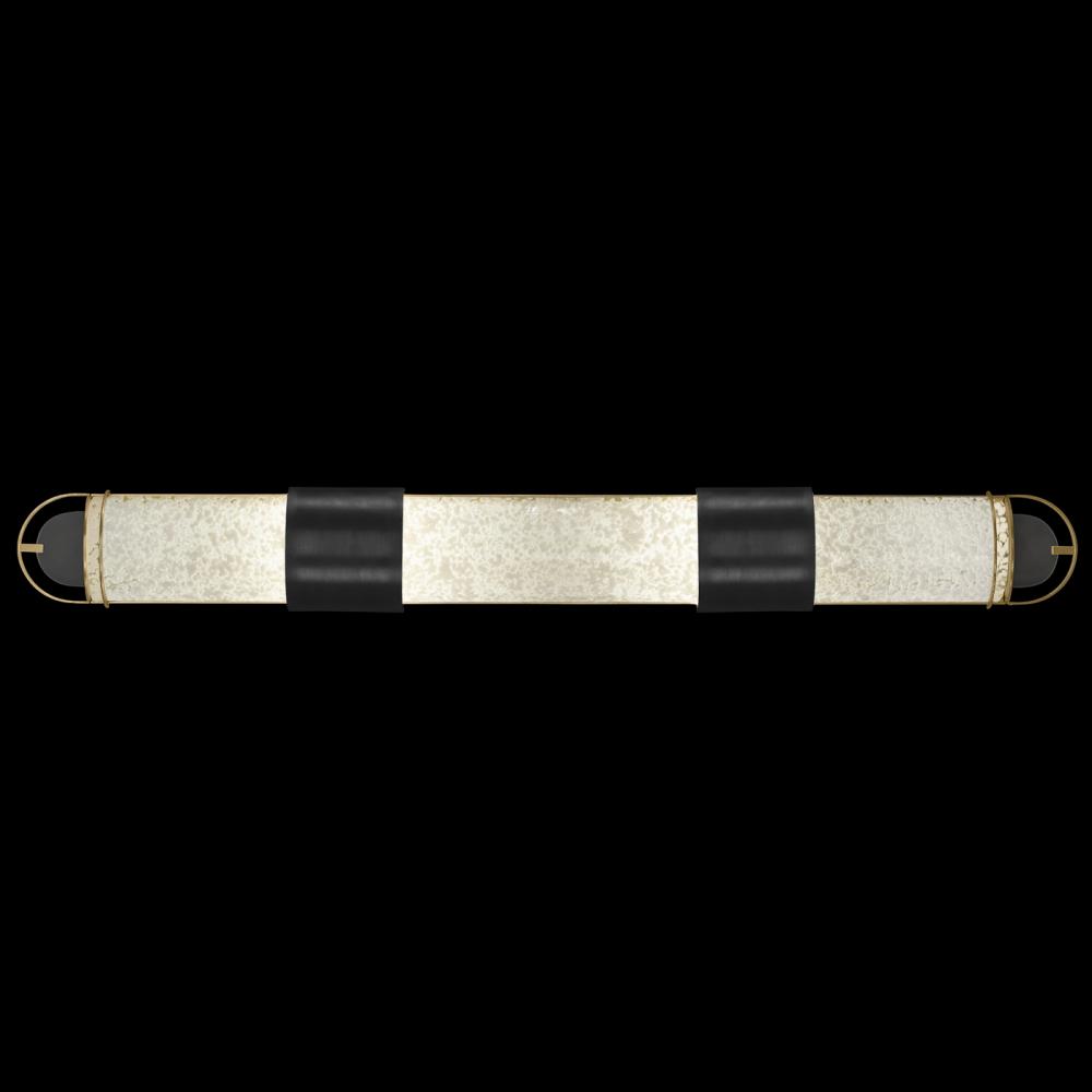 Luxury LED bath fixture featuring illuminated half-cylinders formed by handcrafted glass set within a silhouette, beautifully lit from within, spanning space vertically or horizontally. Shown in our standard Black and Gold Leaf finish with “Bahama Sand” opaline white glass capturing a natural micro pebble finish, reminiscent of shells in the sand.