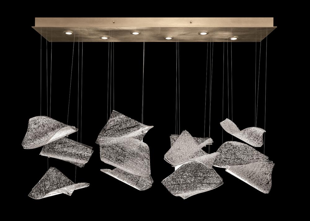 “Frozen Pages” conceptually marks the moments in life we wish we could freeze in time. Each “Frozen Page” is composed of two pieces of fused glass covered with a layer of crystal frit creating a frozen look. By fusing and slumping multiple forms of movement, “Frozen Pages” appears to drift through a room creating flow and interest. Illuminated from a gold leaf canopy and suspended by adjustable cables. This American handmade rectangular fixture features 12 glass “Pages” and is ideal for low ceilings. Shown in a “horizontal” design.
