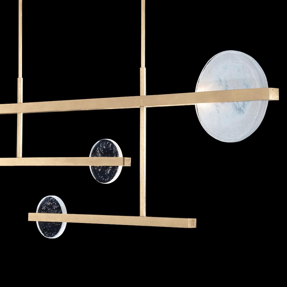 Sculptural linear pendant inspired by the Greek goddess of the moon, Selene. Features illuminated hand cast glass in Full Moon white and New Moon Clear. Available in Standard Finishes, Black Iron, Gold Leaf, Silver Leaf and Soft Gold Leaf. Rod(s) are connectable segments for a customizable length (four 18”, four 12”, two 6” and two 3”).