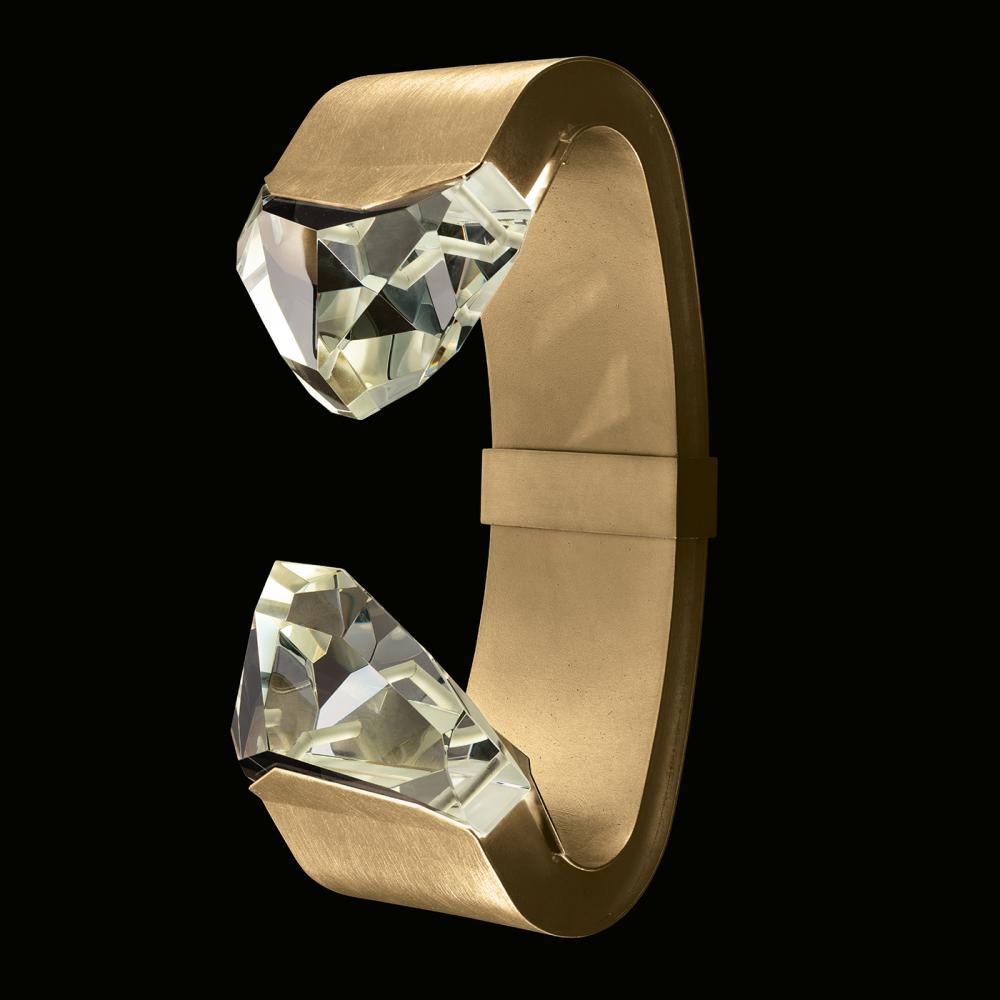Strata - captures the energy of light. Sculptural sconce featuring two LED illuminated hand-carved crystal. Shown in our Standard Gold Leaf finish.