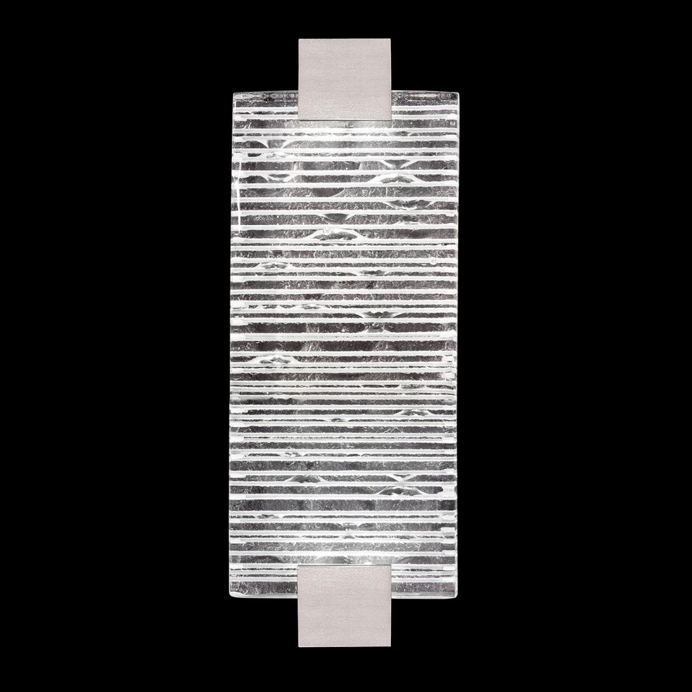 Sconce featuring “Rake” cast glass. Inspired by Zen patterns formed with tiny pebbles, “Rake” combines monumental cast glass with deep hand carved patterns, perfectly captured by an array of hidden waterproof LEDs, giving the glass a truly contemporary feel to an ancient pattern. Choice of three finishes, champagne tinted gold leaf finish or silver leaf (shown) for indoor only, and a hand rubbed black iron for indoor and outdoor use.