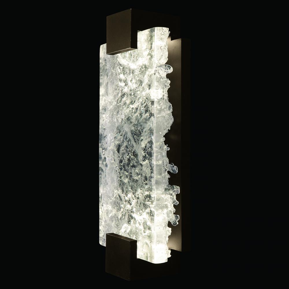 Sconce features a three-dimensional contrast of deep textured and polished cast glass. This stunning landscape of the glass, illuminated by waterproof LEDs, is available in clear or highlighted with antiqued gold leaf. Choice of four finishes, champagne tinted gold leaf finish or silver leaf for indoor only, and a bronze (shown) or hand rubbed black iron for indoor and outdoor use.