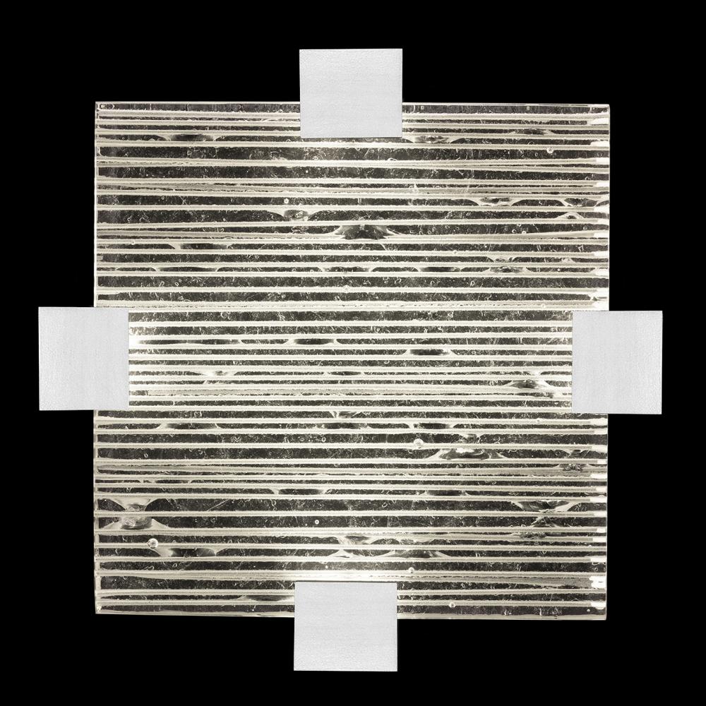Semi-flush mount featuring “Rake” cast glass. Inspired by Zen patterns formed with tiny pebbles, “Rake” combines monumental cast glass with deep hand carved patterns, perfectly captured by an array of hidden waterproof LEDs, giving the glass a truly contemporary feel to an ancient pattern. Choice of three finishes, champagne tinted gold leaf finish or silver leaf (shown) for indoor only, and a hand rubbed black iron for indoor and outdoor use.