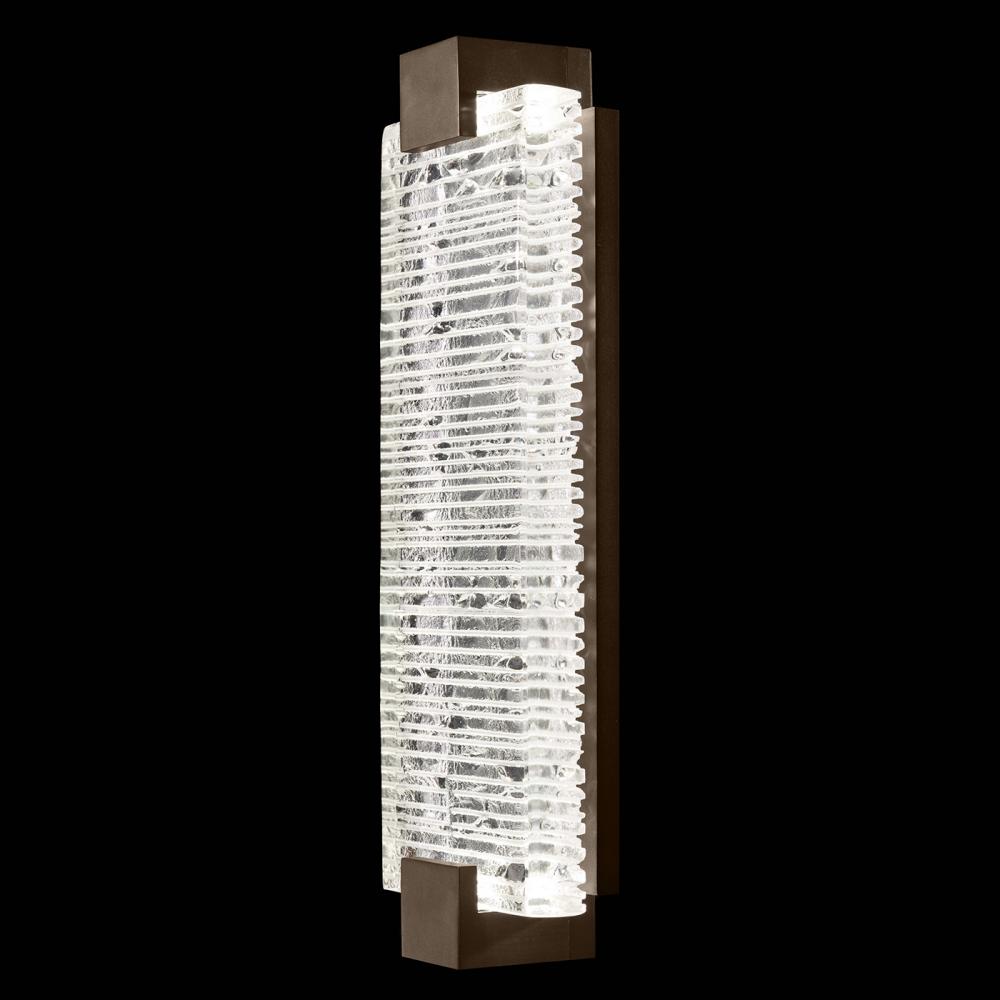 Sconce featuring “Rake” cast glass. Inspired by Zen patterns formed with tiny pebbles, “Rake” combines monumental cast glass with deep hand carved patterns, perfectly captured by an array of hidden waterproof LEDs, giving the glass a truly contemporary feel to an ancient pattern. Choice of four finishes, champagne tinted gold leaf finish or silver leaf for indoor only, and a bronze (shown) or hand rubbed black iron for indoor and outdoor use.