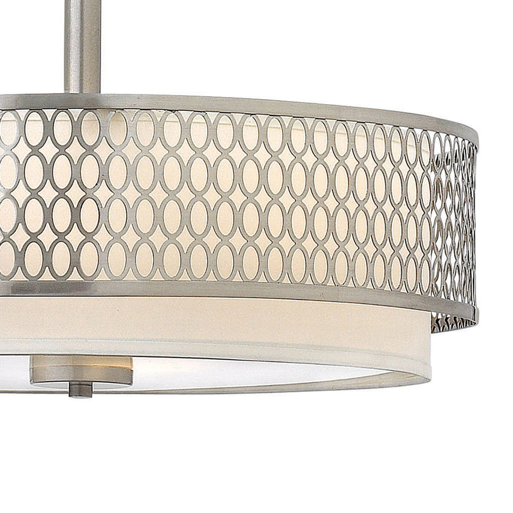 Jules features a repeating stamped oval design in a luxe Brushed Gold or Brushed Nickel finish. This striking pattern play creates a statement-making transitional silhouette.