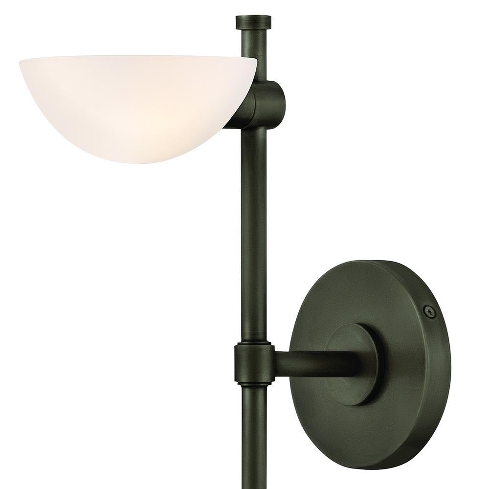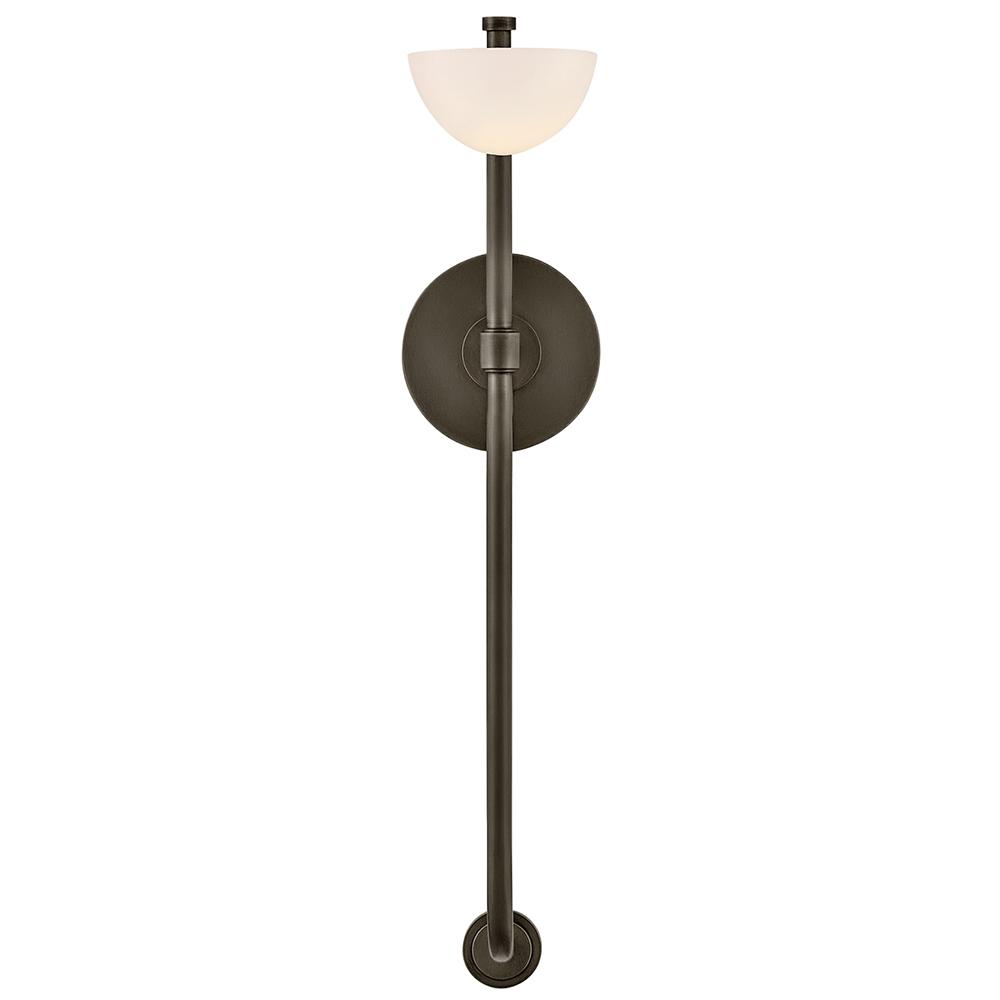 Minimal with a tall, transitional torchier silhouette, Merit features a shallow, shell-shaped, etched and painted white glass shade. Its slim stem, finished in Black Oxide or Heritage Brass, perfectly complements the sconce’s soft, dimmable uplighting.