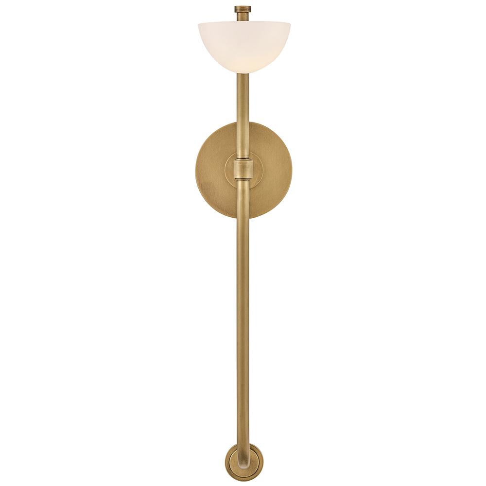 Minimal with a tall, transitional torchier silhouette, Merit features a shallow, shell-shaped, etched and painted white glass shade. Its slim stem, finished in Black Oxide or Heritage Brass, perfectly complements the sconce’s soft, dimmable uplighting.