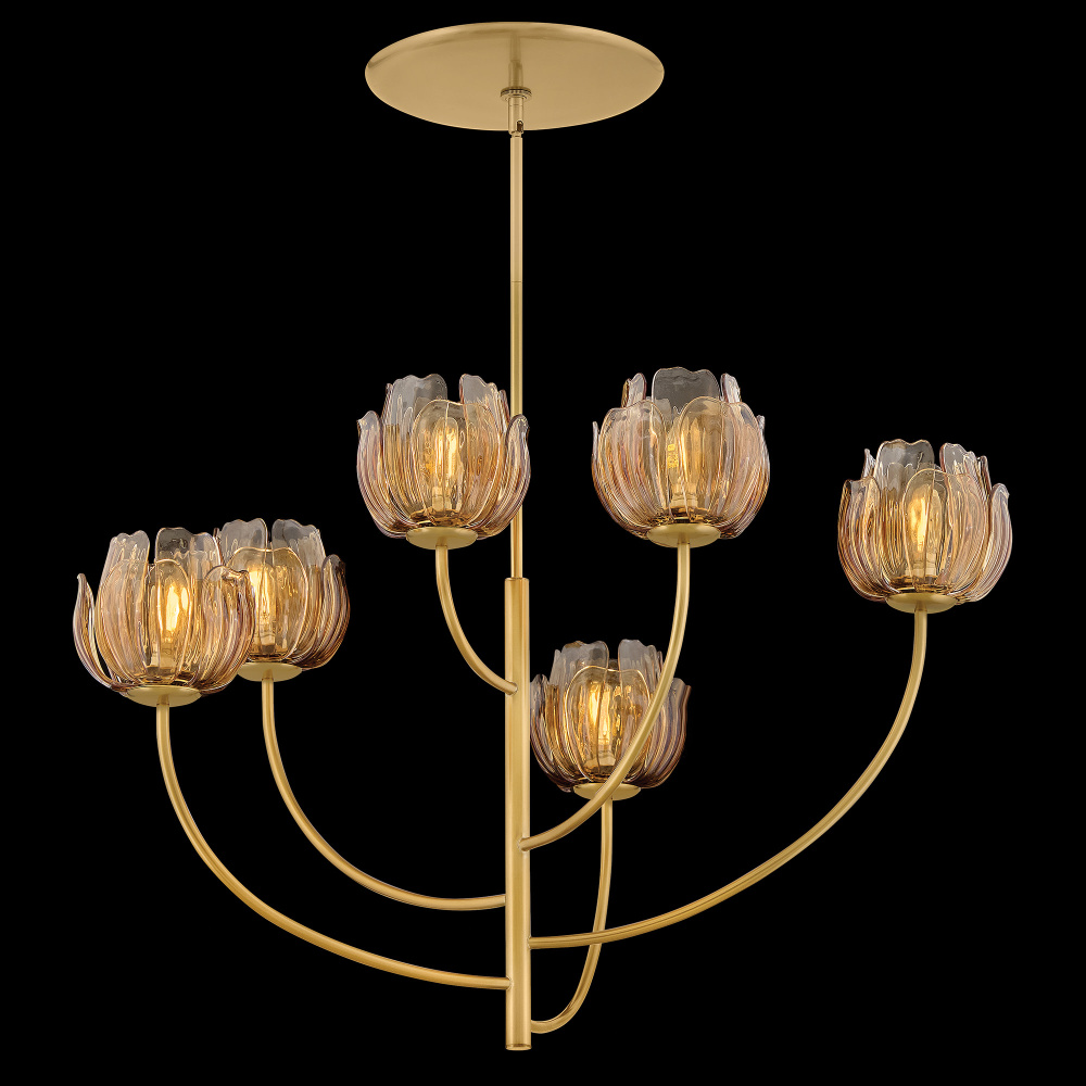 Fantine’s flowing blooms are inspired by preserved flowers suspended in time. Uniquely shaped artisan-sculpted glass arranged in lush layers creates an ethereal dance of light and shadow. An exaggerated canopy and slender stems are crafted from solid brass in a hand-touched Unlacquered Brass finish.