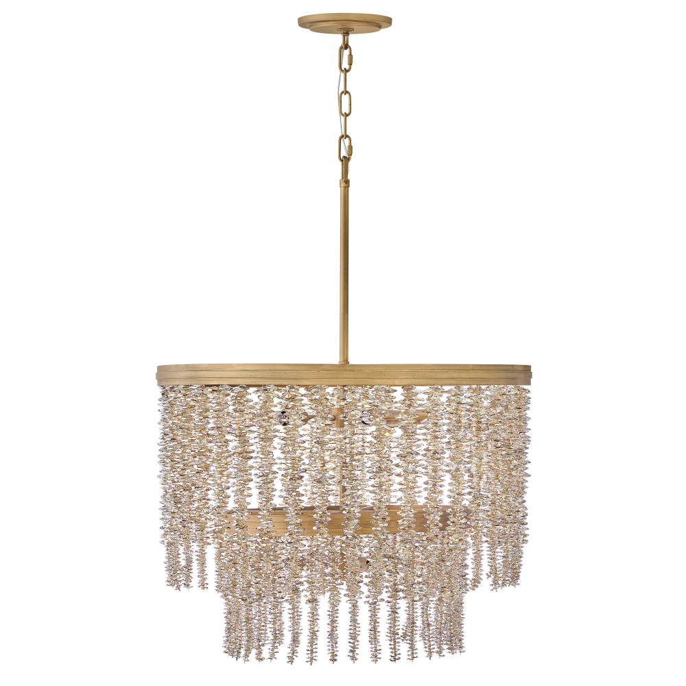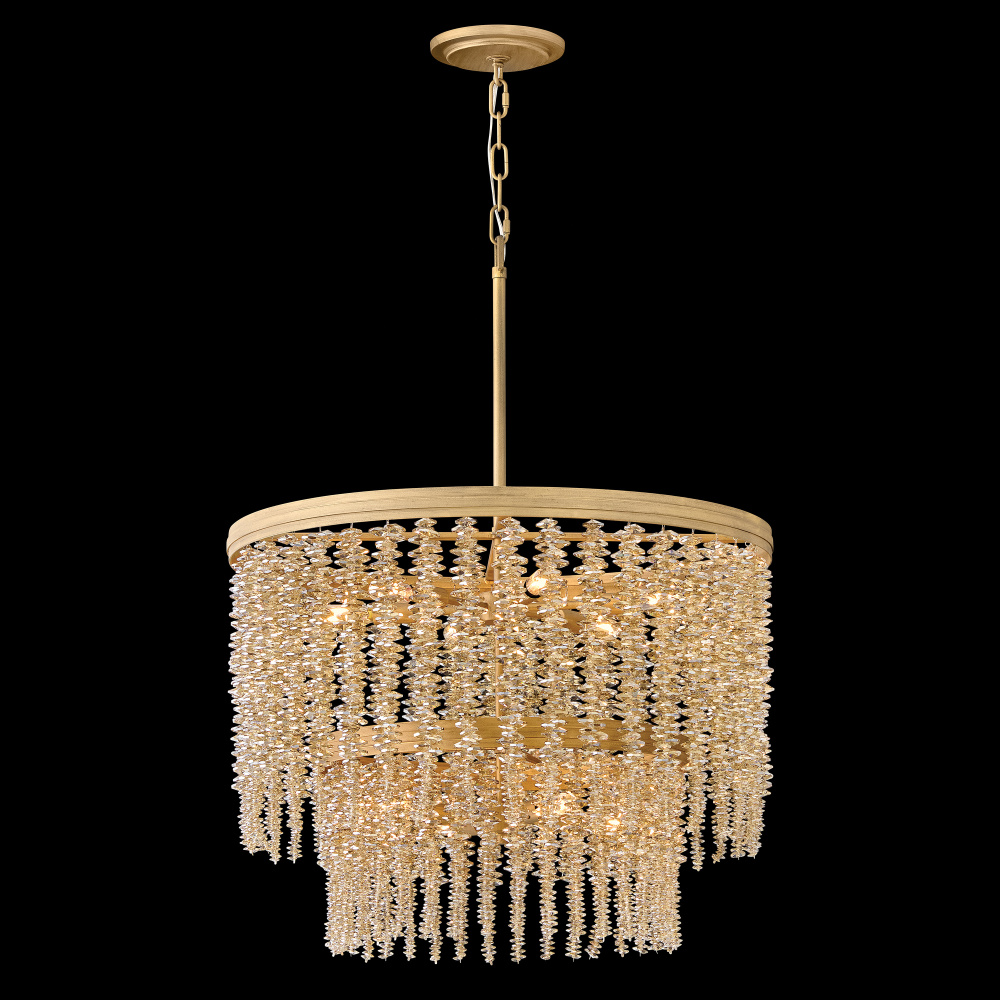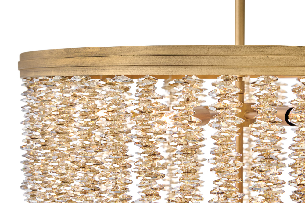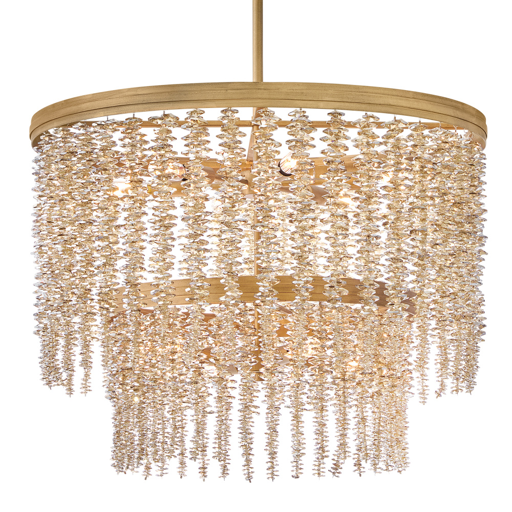 Dripping with glamour, Rubina’s magnificent shade is crafted from individually strung strands of sparkling crystal. A traditional tiered frame accentuates every beautiful refraction with its Burnished Gold finish.