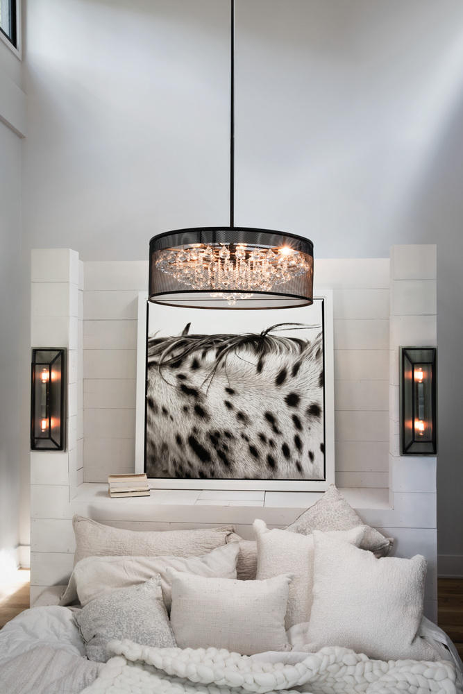 Fiona features a sleek industrial Black mesh outer drum shade encircling tiered glass spheres for the ultimate pairing of industrial-chic design details.