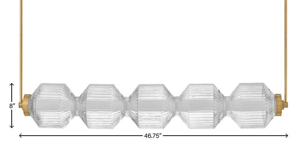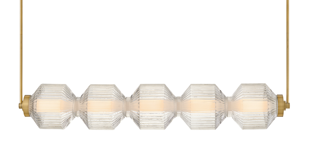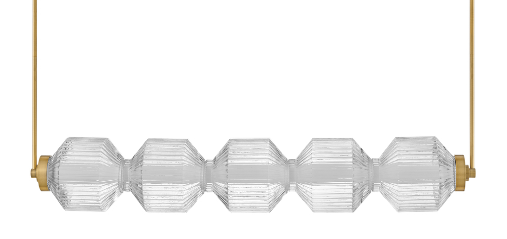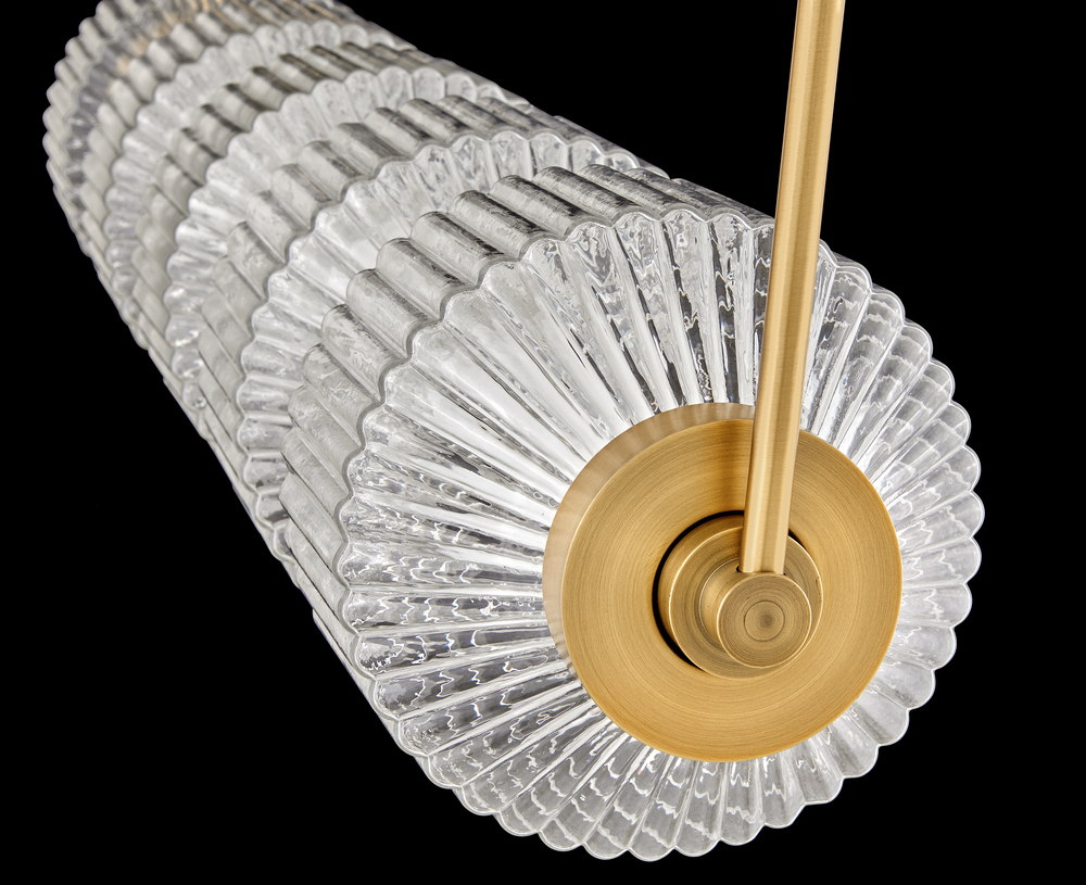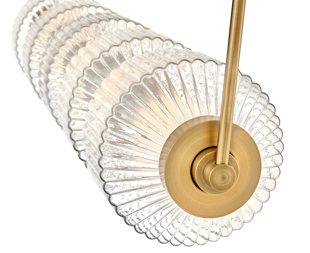 Reign's glamorous silhouette combines textural interest and transitional elements for a vibrant and versatile collection. Clear ribbed glass shades and a gleaming Lacquered Brass finish present a captivating form from any angle. Illuminated by integrated LED lighting.