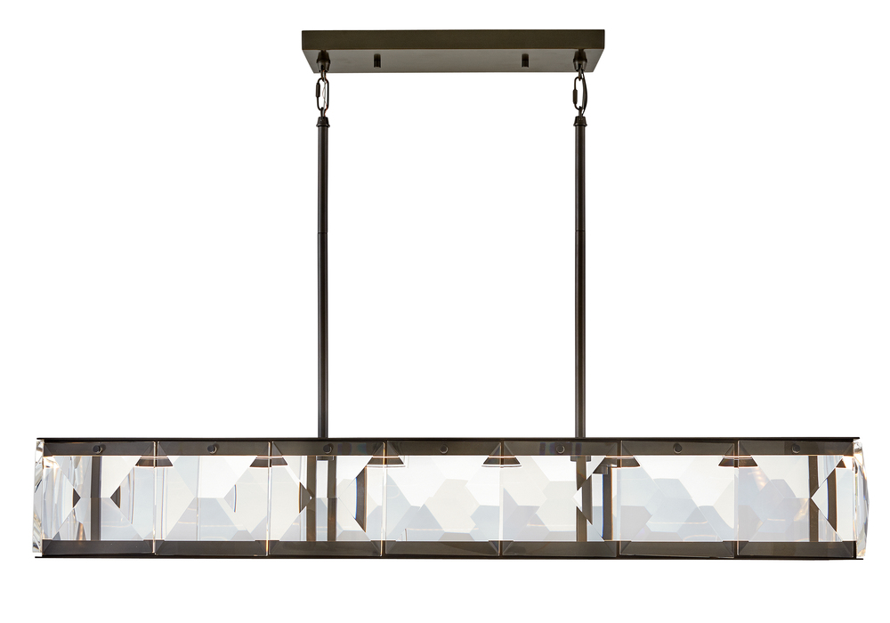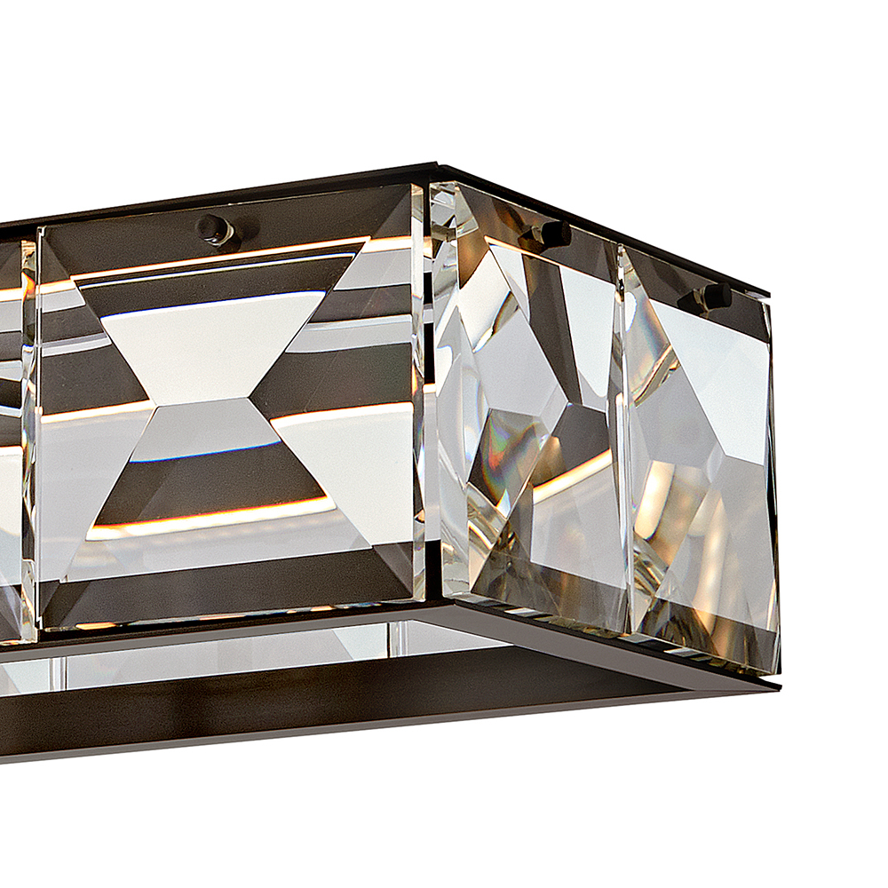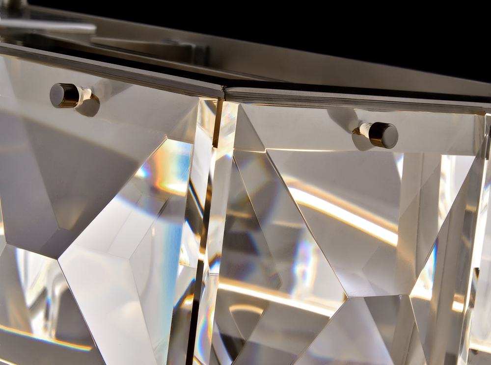 Jolie is a unique blend of sophistication, style, and technology. Integrated LEDs are sleekly concealed within gleaming Heritage Brass rings at the top and bottom of the design. Robust blocks of faceted crystal radiate with light, creating a transfixing silhouette while providing outstanding illumination.