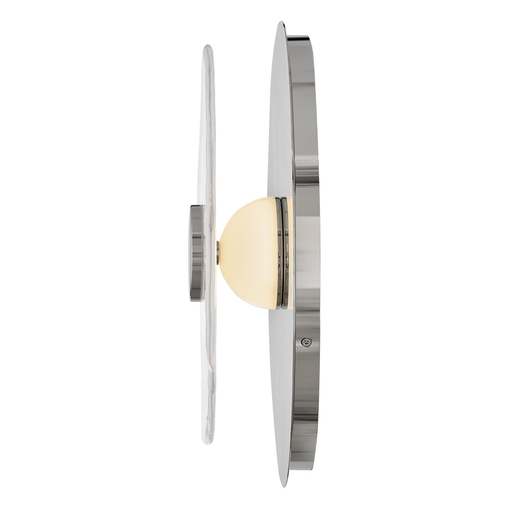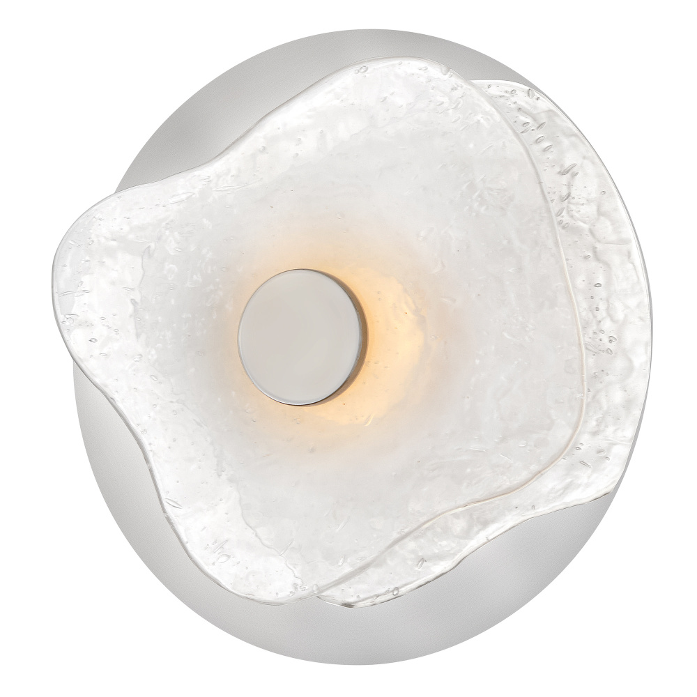 Balancing chic style and versatility, Iona’s modern, asymmetrical design is defined by artisan-sculpted art glass hand-painted with a smooth ombre transitioning from frosted white to clear. Soft, dimmable LEDs emphasize subtle textures and distinctive details in the glass’s surface, further highlighted by an exaggerated backplate. Mount as a sconce or as a sleek flush mount.