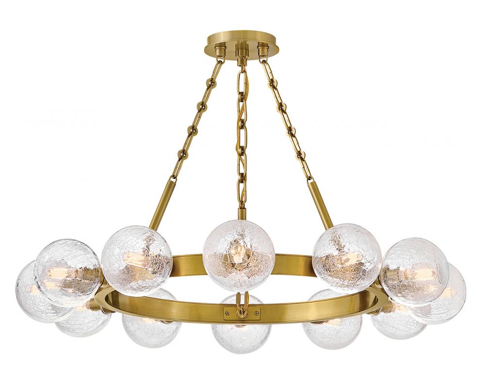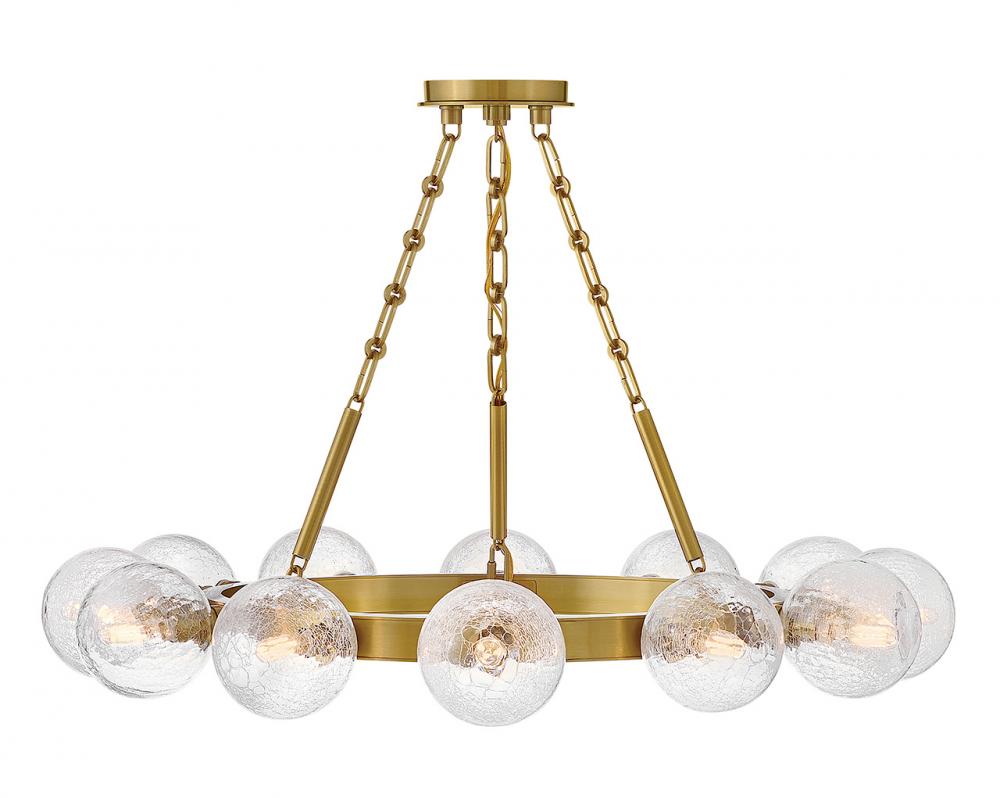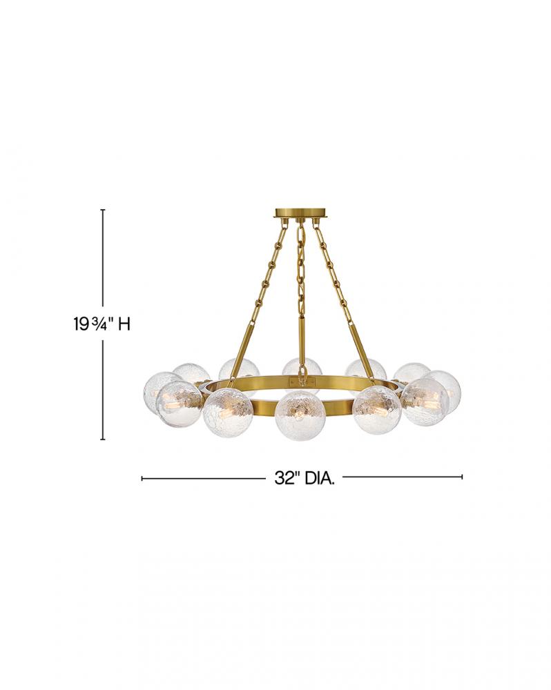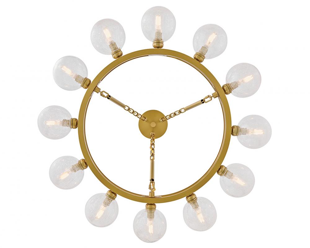 Dramatic crackled glass globes surround Coco’s timeless silhouette with unexpected, distressed detailing. Minimal framing suspended from decorative stem-to-chain uprights features a warm and inviting Lacquered Brass finish.