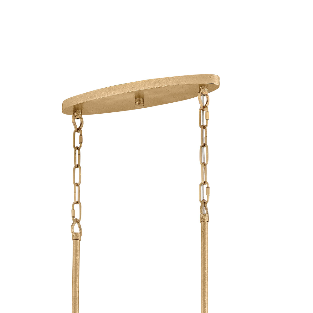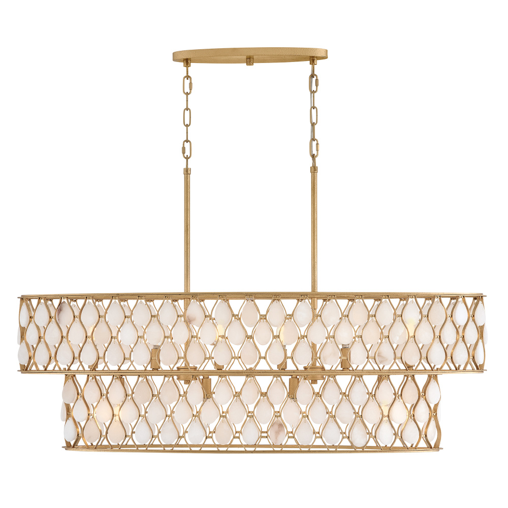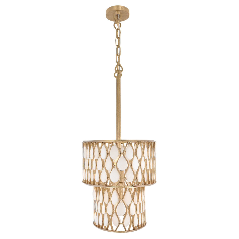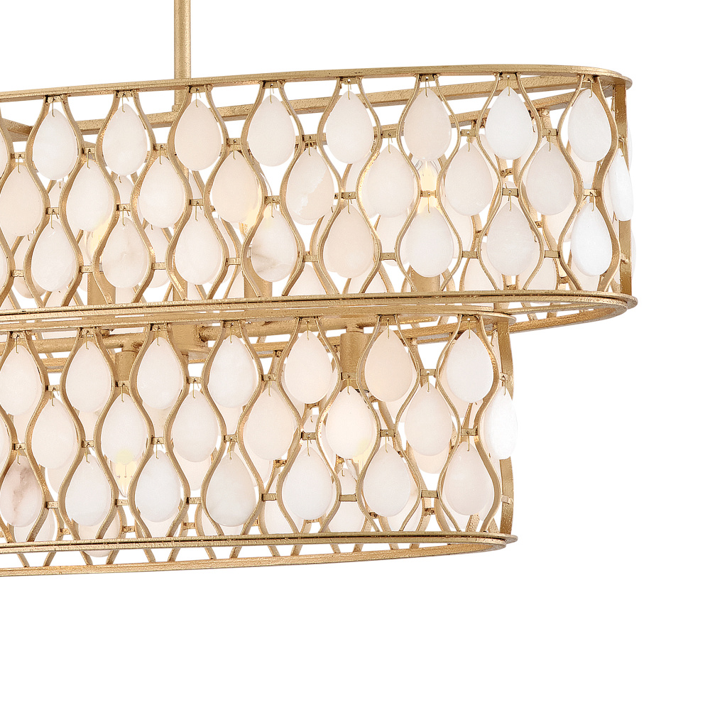 Opulently adorned with natural alabaster stones held within a traditional latticework shade, Estie brings organic elegance to any decor aesthetic. Intricately curved metalwork complements the frame, chain, and canopy in a textured, hand-painted Piastra Gold finish