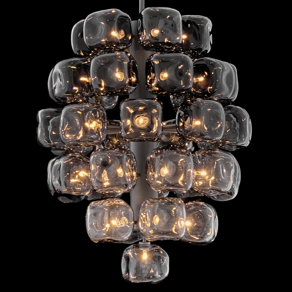 Inspired by the glamour of gemstone-adorned jewelry, Perriand’s varying hues are arranged in a striking ombre, transitioning from Smoke or Light Amber glass to clear glass. An intricate frame, rounded canopy, and slender stem in timeless finishes complete this contemporary art piece, making a striking modern statement in any setting.