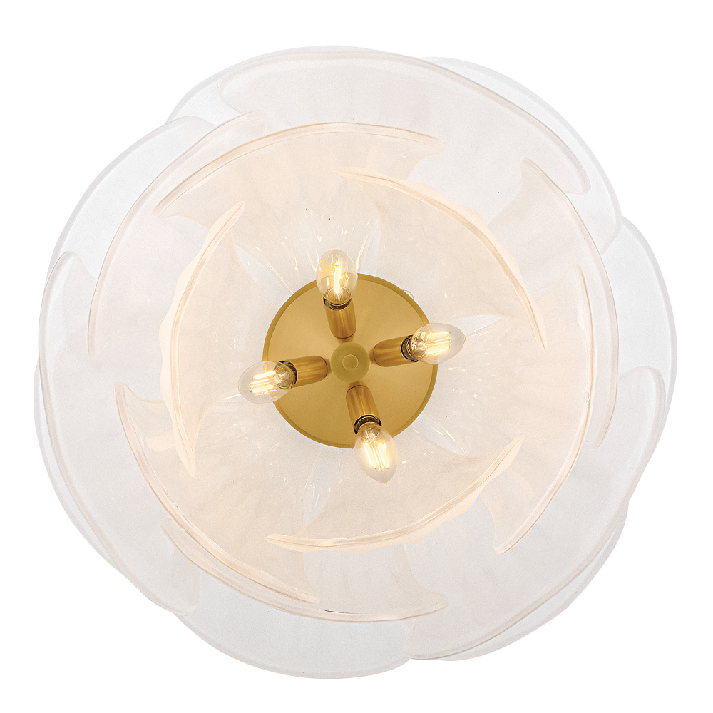 Fantine’s flowing blooms are inspired by preserved flowers suspended in time. Uniquely shaped artisan-sculpted glass arranged in lush layers creates an ethereal dance of light and shadow. An exaggerated canopy and slender stems are crafted from solid brass in a hand-touched Unlacquered Brass finish.