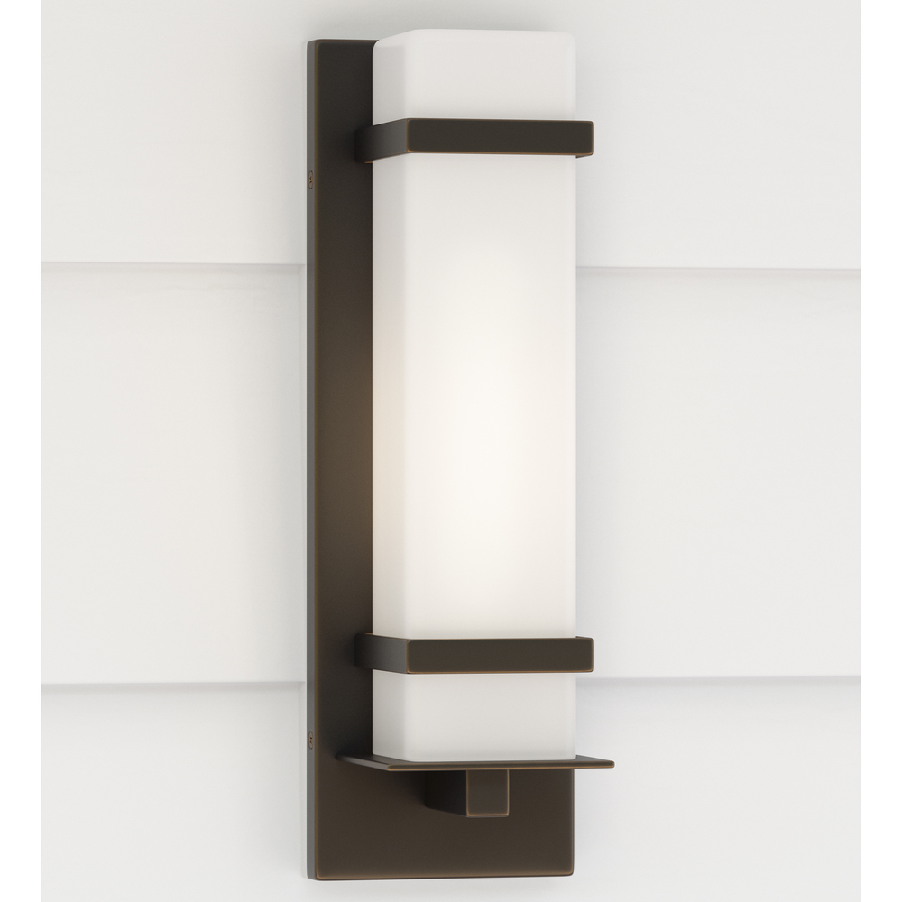 The Alban one light outdoor wall fixture in antique bronze creates a warm and inviting welcome presentation for your home's exterior. Alban has modern charm with a minimalist twist. Etched Opal Glass shades bring simplicity to any outdoor living space whether it be a covered porch, deck, patio or walkway. This Modern outdoor wall fixture features a sturdy cast aluminum construction, two finish options and Opal Etched cylindrical or square glass shades.