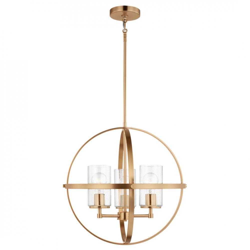The Alturas three light single tier chandelier in Satin Brass is the perfect way to achieve your desired fashion or functional needs in your home. The silhouette of the modern Alturas lighting collection by features an interlocking, spherical steel frame, which harkens back to the Unisphere constructed for the 1964 New York World's Fair. The minimalist Alturas Collection draws the eye to the soft, warm glow of the light emitted from the cylindrical Clear Seeded glass shades and the full assortment includes three-, five- and nine-light chandeliers. All fixtures are offered in Brushed Oil Rubbed Bronze, Brushed Nickel, Midnight Black and Satin Brass finishes. Incandescent and ENERGY STAR-qualified LED lamping are available; all fixtures are California Title 24 compliant.