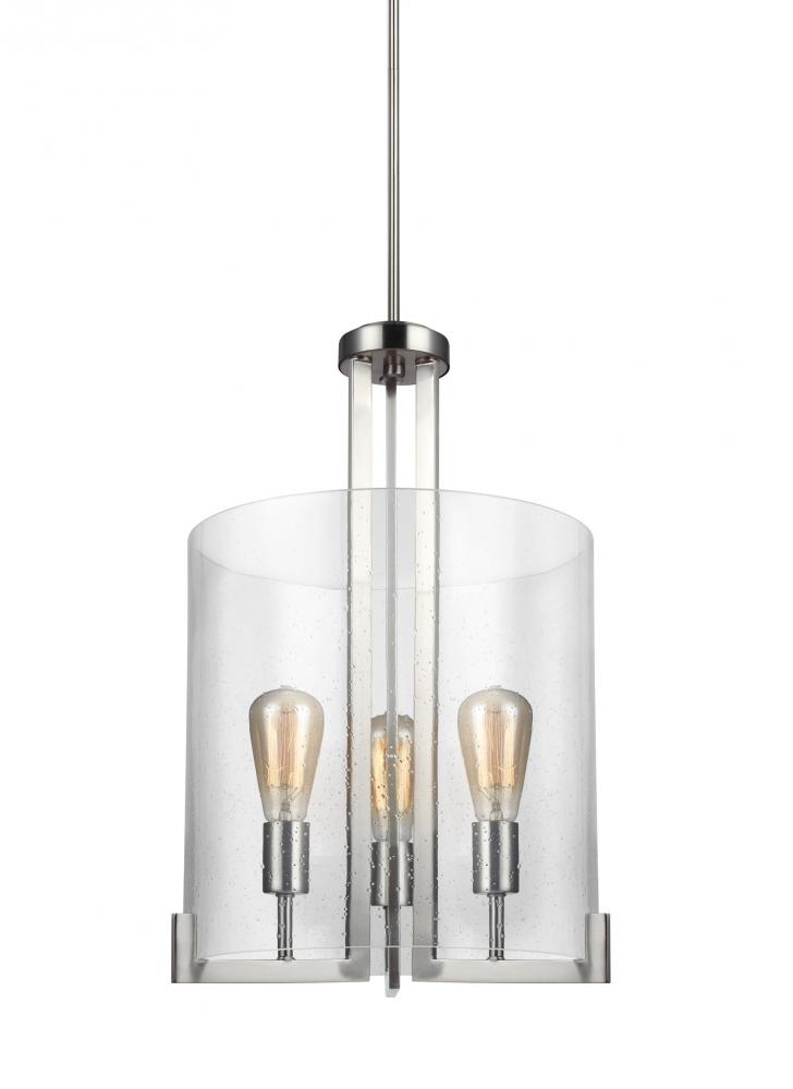 The Dawes three light indoor pendant in brushed nickel is the perfect way to achieve your desired fashion or functional needs in your home. This chic Dawes pendant light by will gracefully take center stage in any foyer, kitchen or dining room. The sleek, modern silhouette adds excitement to any room without over shadowing furniture and decor. Light shines through a Clear Seeded glass shade, making the Dawes pendant an airy, unobtrusive but definitive style statement that comes to life with its cylindrical shape. Dawes comes in a choice of either a Brushed Nickel or Burnt Sienna finish which offers a clean, simplistic design to complement your living room, dining room, or in a cluster over a kitchen island. Fixtures are California Title 24 compliant and easily convert to LED by purchasing LED lamps sold separately.