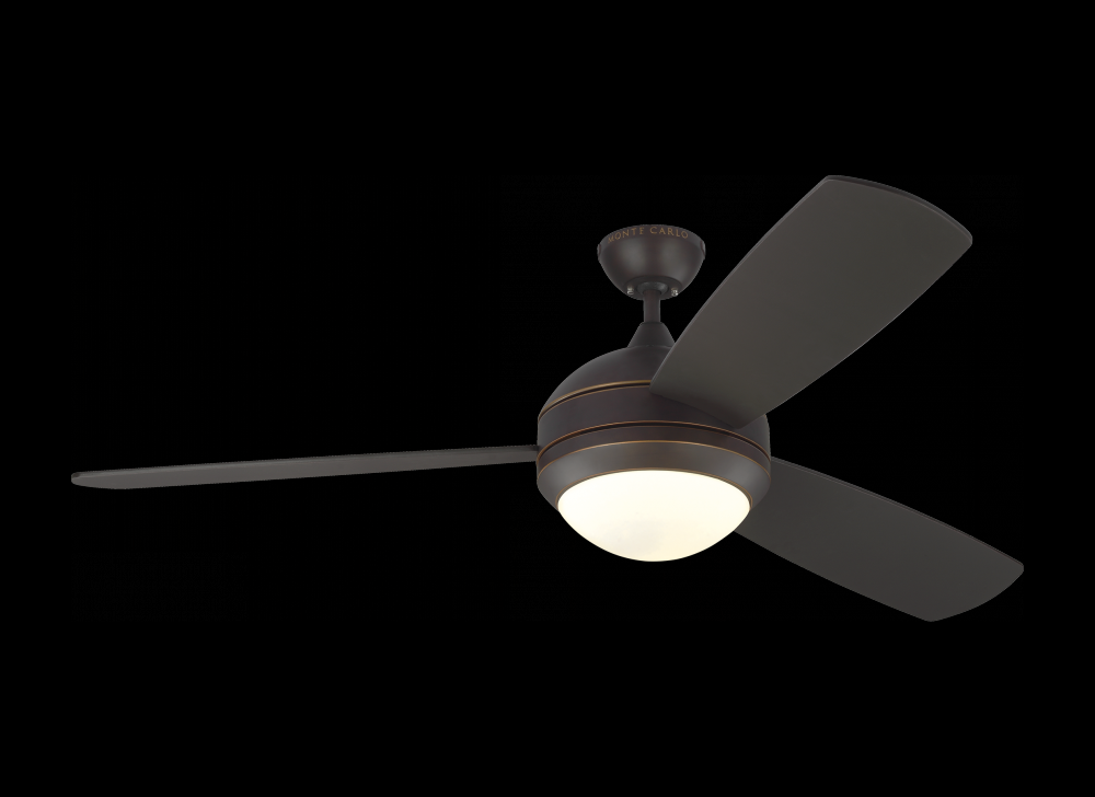 The Discus Trio 58 LED - Roman Bronze in roman bronze features a 172.0 X 20.0 4 speed motor with a Sixteen degree blade pitch. The Discus Trio Max is a three-bladed beauty, taking design inspiration from the popular 52†Discus ceiling fan by Monte Carlo. with a minimalist, contemporary design, and three color (finish) options, one of which has reversible dual-finish blades, it can complement a wide variety of room décor. The Discus Trio Max features an integrated 18W LED downlight with 700 net lumens of output, 2700K CCT and a CRI of 90+. An optional finishing cap is available (sold separately) for use without the light kit. Damp-rated for indoor/outdoor use, the Discus Trio Max also comes with a hand-held remote with four speeds, reverse and LED light dimmer.