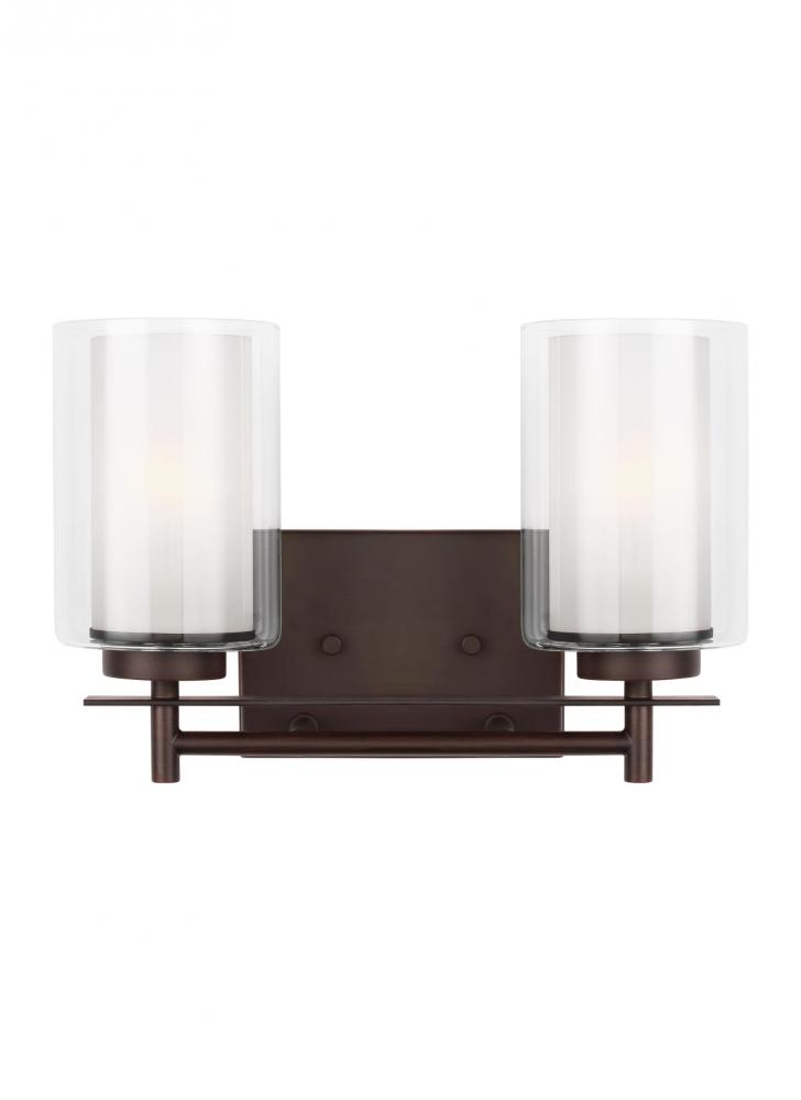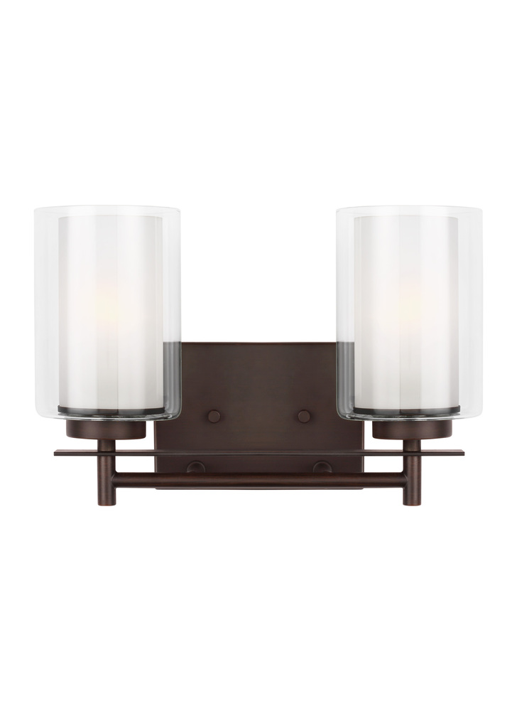 The Elmwood Park two light vanity fixture in bronze offers shadow-free lighting in your powder room, spa, or master bath room. Elmwood Park by has clear glass tube shades with an inner white glass element that softens the light and helps cast an even glow. A cylinder of etched glass is centered within a larger cylinder of clear glass which encircles each light bulb to create this stunning visual effect. The full assortment includes three-, five-and nine-light chandeliers, a four-light linear, one-light mini pendant, a three-light pendant, a two-light semi flush which is convertible into a pendant, and one-, two-, three- and four-light bath fixtures. All fixtures offered in either a Brushed Nickel or Brushed Oil Rubbed Bronze. Incandescent and ENERGY STAR-qualified LED lamping are available; all fixtures are California Title 24 compliant.