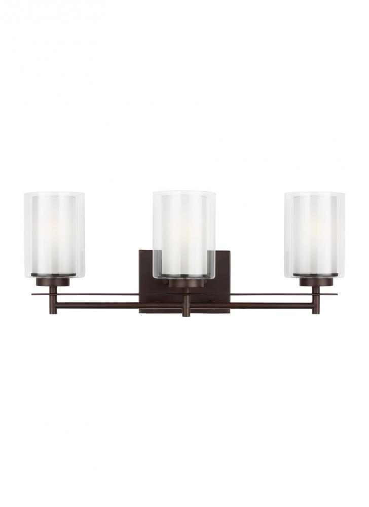 The Elmwood Park three light vanity fixture in bronze provides abundant light for your bath vanity, while adding a layer of today's style to your interior design. Elmwood Park by has clear glass tube shades with an inner white glass element that softens the light and helps cast an even glow. A cylinder of etched glass is centered within a larger cylinder of clear glass which encircles each light bulb to create this stunning visual effect. The full assortment includes three-, five-and nine-light chandeliers, a four-light linear, one-light mini pendant, a three-light pendant, a two-light semi flush which is convertible into a pendant, and one-, two-, three- and four-light bath fixtures. All fixtures offered in either a Brushed Nickel or Brushed Oil Rubbed Bronze. Incandescent and ENERGY STAR-qualified LED lamping are available; all fixtures are California Title 24 compliant.