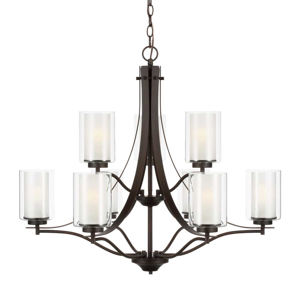 The Elmwood Park nine light multi-tier chandelier in bronze provides abundant light to your home, while adding style and interest. Elmwood Park by has clear glass tube shades with an inner white glass element that softens the light and helps cast an even glow. A cylinder of etched glass is centered within a larger cylinder of clear glass which encircles each light bulb to create this stunning visual effect. The full assortment includes three-, five-and nine-light chandeliers, a four-light linear, one-light mini pendant, a three-light pendant, a two-light semi flush which is convertible into a pendant, and one-, two-, three- and four-light bath fixtures. All fixtures offered in either a Brushed Nickel or Brushed Oil Rubbed Bronze. Incandescent and ENERGY STAR-qualified LED lamping are available; all fixtures are California Title 24 compliant.