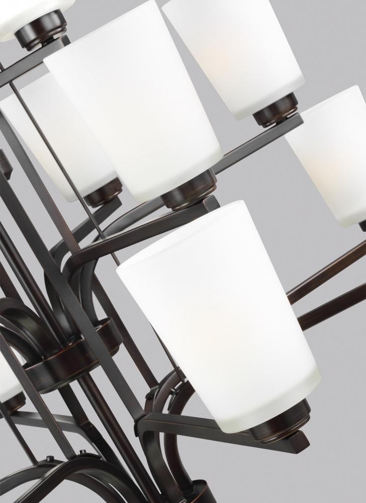 The Franport fifteen light multi-tier chandelier in bronze enhances the beauty of your home with ample light and style to match today's trends. Modernist influences abound in the Franport Collection. Shades with sharp lines and simplified bases showcase the minimalist approach with a twist. Franport has fixtures for all parts of the property. Available in both Burnt Sienna and Brushed Nickel finish choices as well as Nickel for bath fixtures. with fixtures in various sizes and configurations, the Franport Collection will coordinate the same design theme across several different rooms. Its assortment includes three-, five-, nine- and fifteen-light chandeliers; and one- two-, three- and four- light bath vanity fixtures. The Franport collection pars wonderfully with Geary ceiling fixtures. Incandescent and ENERGY STAR-qualified LED lamping are available; all fixtures are California Title 24 compliant.
