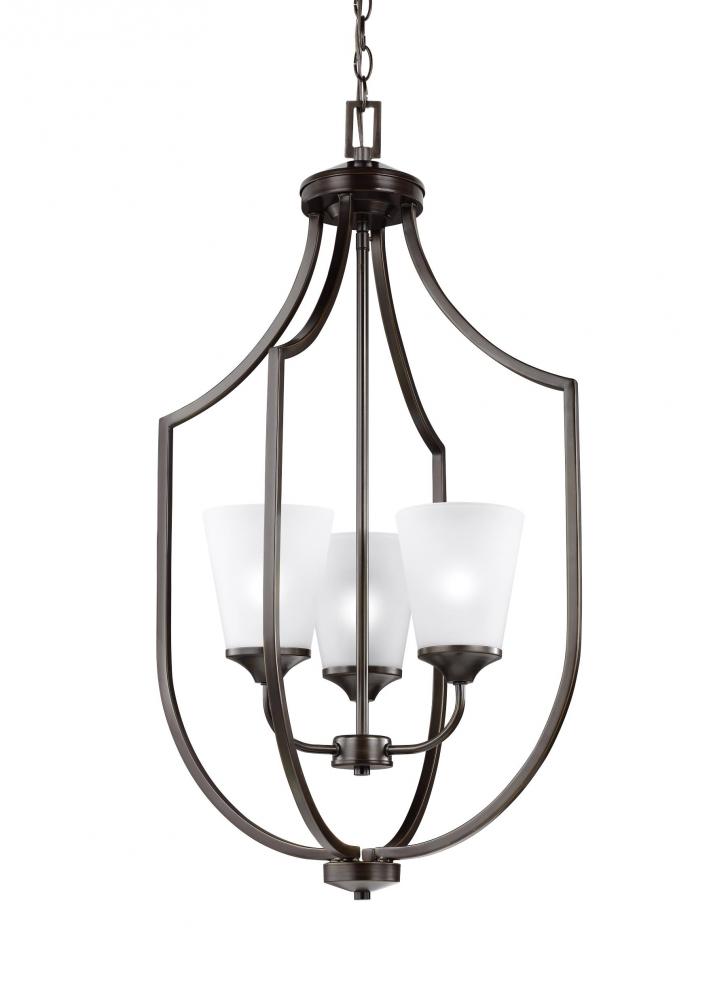 The Sea Gull Lighting Hanford Three Light Indoor Pendant In Burnt Sienna Is The Perfect Way To Achieve Your Desired Fashion Or Functional Needs In Your Home. The Transitional Styling Of The Hanford Lighting Collection By Sea Gull Lighting Is Evident In Its Elegant Symmetry Articulated By Long, Sweeping Arms. Tapered Etched Glass Shades Produce A Soft Uplight And Make Hanford Complementary To A Wide Array Of Dã©Cor From Traditional To Contemporary. Offered In Both Brushed Nickel And Burnt Sienna Finishes, The Collection Includes Five-, Nine- And Fifteen-Light Chandeliers, A Three-Light Hall/Foyer Light, A One-Light Mini Pendant, A Three-Light Pendant, A Three-Light Semi-Flush Mount Which Can Convert Into A Pendant, And One-, Two-, Three- And Four-Light Bath Fixtures. Incandescent And Energy Star-Qualified Led Lamping Are Available; All Fixtures Are California Title 24 Compliant.