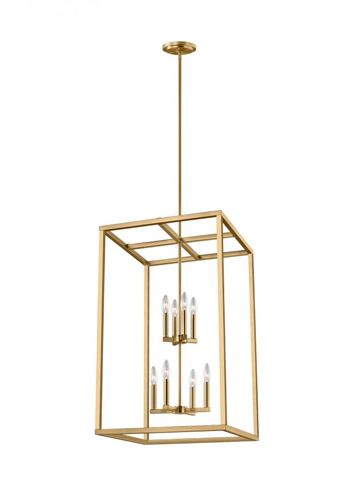 The Moffet Street eight light indoor pendant in satin brass provides abundant light to your home, while adding style and interest. The Moffet Street series offers a distinctive take on a rustic theme. Built in broad steel frames with hand-applied finish that mimics natural wood. This combination of rustic and urban fits comfortably in a wide variety of environments. The sharp, squared lines of the frame complement a wide variety of settings. The collection includes eight-light foyer, four-light foyer, one- light wall sconce, and a six-light island fixture. The Moffet Street series is available in three beautiful finishes Washed Pine, Brushed Nickel and Satin Bronze All fixtures are California Title 24 compliant and damp rated for use in sheltered, damp environments.