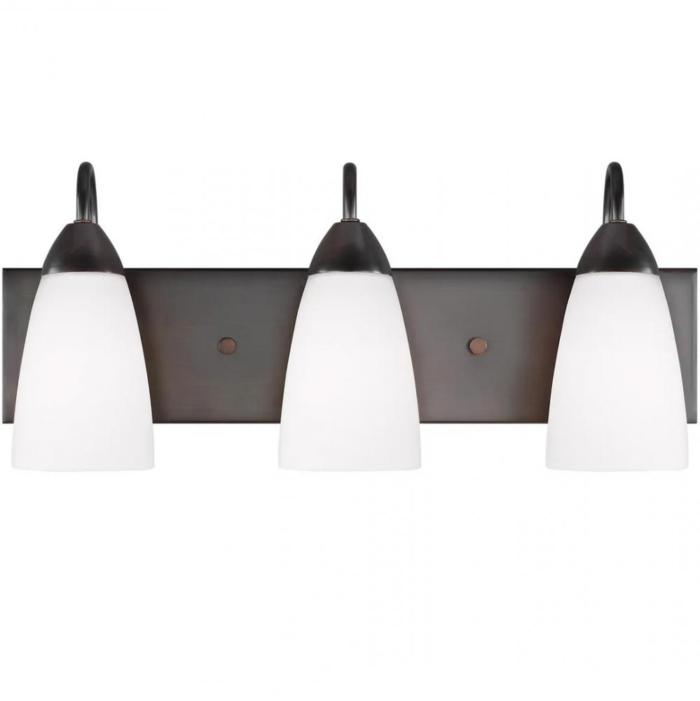 The Seville three light vanity fixture in bronze offers shadow-free lighting in your powder room, spa, or master bath room. The Seville collection represents commitment to high style at a sharp price. The modernist design is epitomized by the teardrop curves in the arms tipped by Etched glass diffusors throughout the chandeliers and bath fixtures. The collection offers a whole home lighting solution in every imaginable category. The assortment includes nine-light, five-light, and three-light chandeliers (either with up-light or down-light), pendants in four sizes as well as one-light, two-light, three-light , four-light and five-light wall/bath fixtures. Install a stylish and elegant addition to any room in the house. Seville is offered in Brushed Nickel and Burnt Sienna finishes.